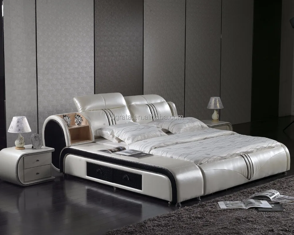 2018 Modern Genuine Leather Bed With Lockers Night Table Large