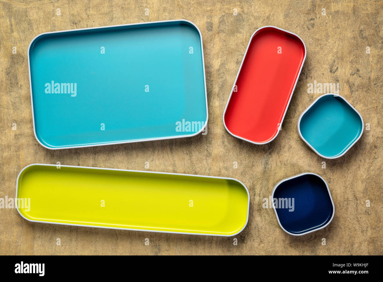 Top View Of Colorful Drawer Organizer Bins Against Textured Bark