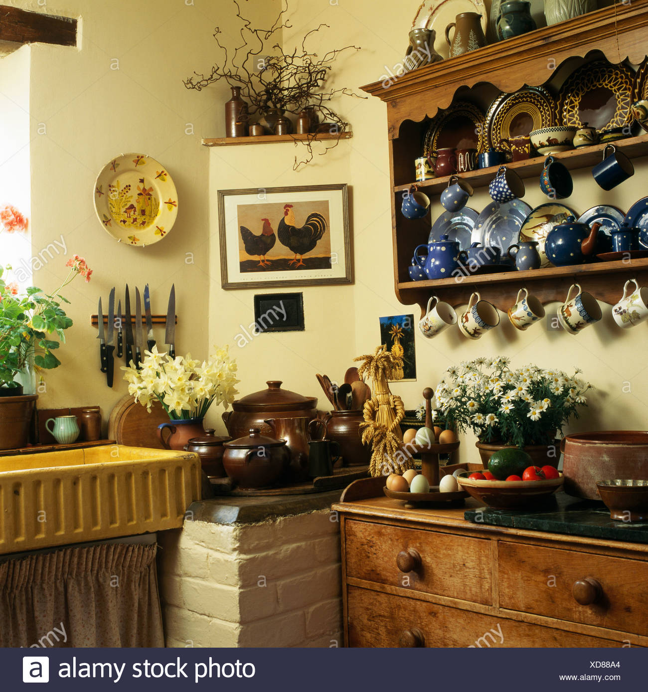 Blue China On Pine Shelves Above Old Wooden Chest Of Drawers In