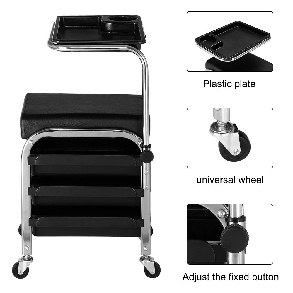 Onyx salon nail cart trolley organizer padded stool seat chair with 3 tiers shelf pull out storage drawer tray caster wheels black 225 lbs.