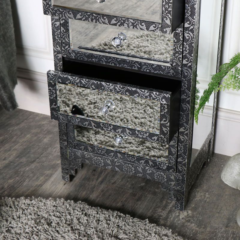Black Silver Embossed Mirrored Glass Chest Of Drawers T4312 Ebay