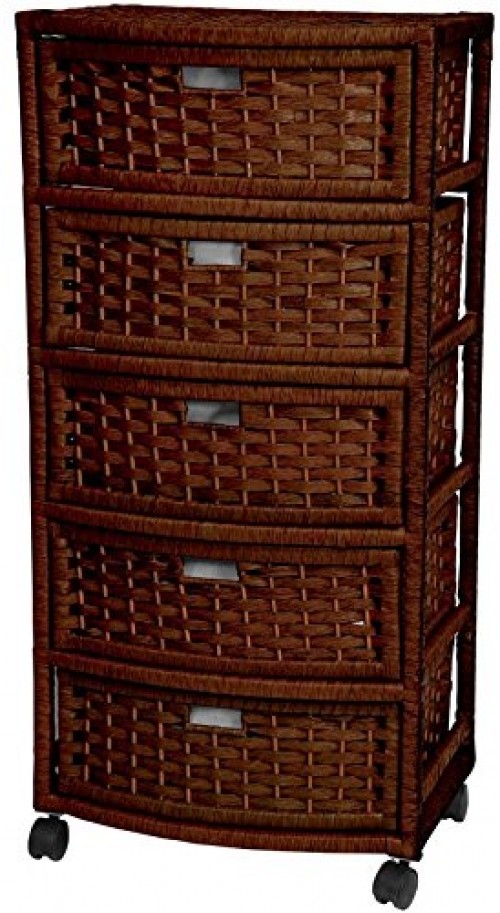 Small Chest Of 5 Drawers Brown Rattan Rolling Wheels Natural Fiber